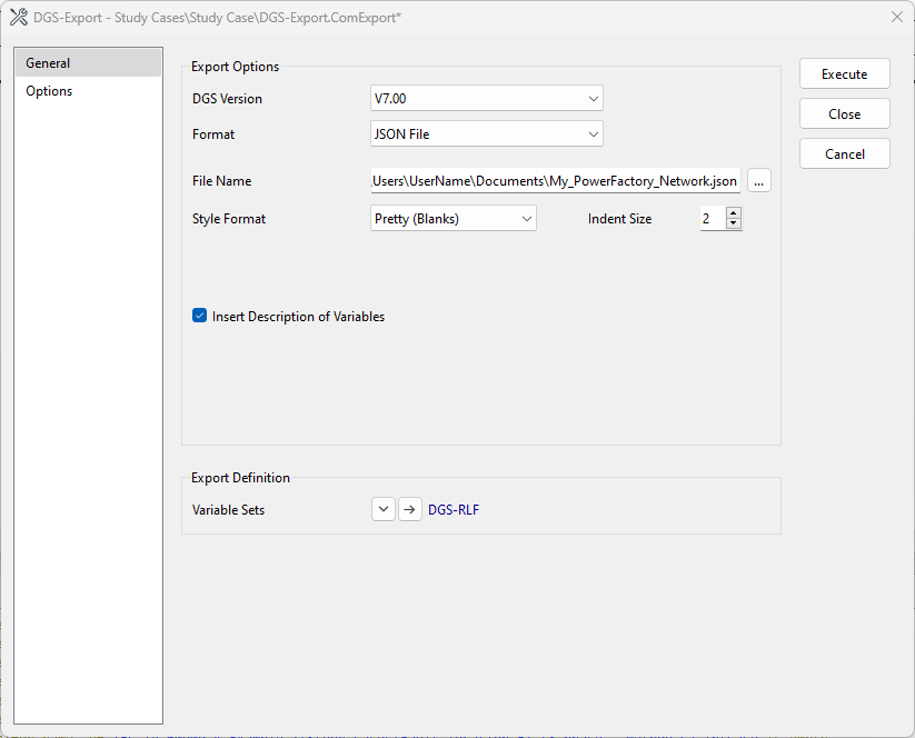 Note that the “Variable Sets” field in the “Export Definition” section is set to the DGS-RLF file provided by